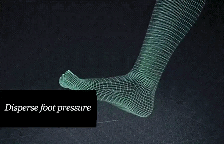 Simulând mișcarea naturală a piciorului, favorizează o tranziție fluidă de la călcâi la vârf. Acest design nu numai că îmbunătățește confortul la mers, dar stimulează și circulația sanguină în membrele inferioare, favorizând revenirea venoasă datorită efectului de pompă musculară.
